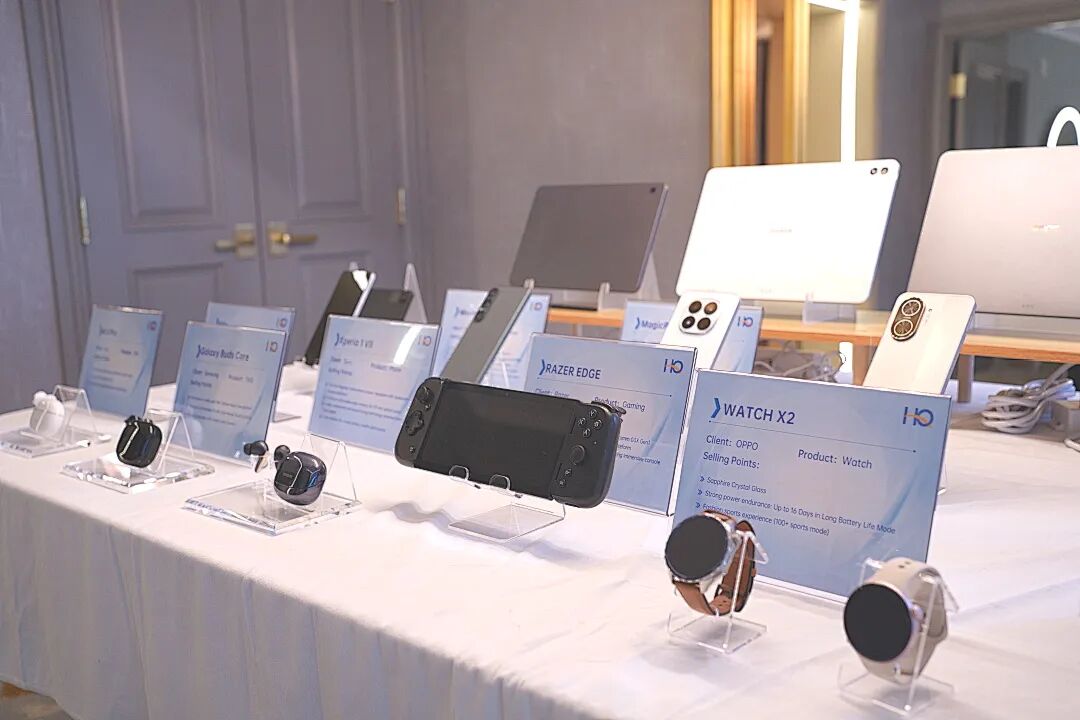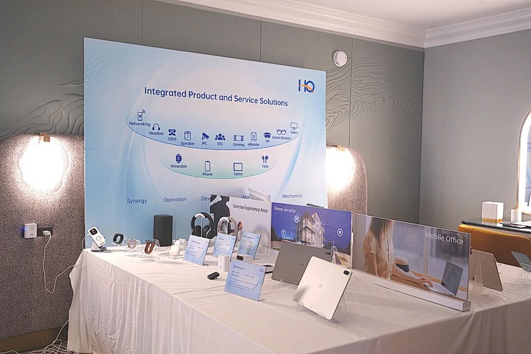 在移动消费电子展区,华勤技术搭建了一站式体验区,集中展示了手机、平板、穿戴、音频、IP Camera、智能电子相册等多款创新产品,通过覆盖结构设计、防水工艺、射频天线、外观美学到组装制造的全链路技术积淀,全面夯实了消费电子基本盘。