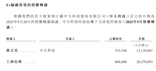 2025年9月,股东蒋文昊及上海长舜分别向中天科技转让33.33万股、66.67万股,转让代价分别为1313.9万元、2627.81万元,合计约3941.7万元。转让完成后,上海长舜完全退出股东名单,蒋文昊仍持有公司0.8%的股份。