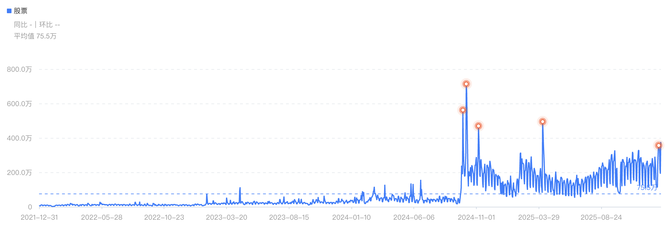 再看一下股票就更明显了,从2022年到2024年9月份之前,股票的热度一直都非常低迷,但是2024年9月底的行情,直接把股票的关注度拉了起来,从那以后股票的关注度就有了大幅提升,而且一直是保持这个状态的。