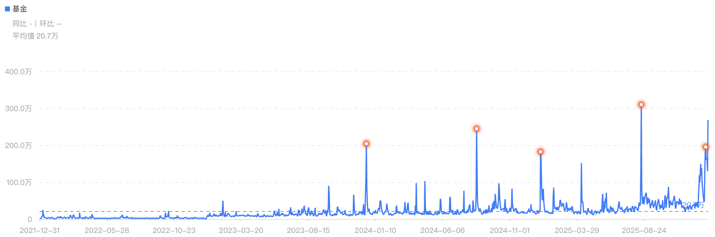 最后看一下有关基金的信息,当前基金的热度已经来到非常高的位置了。不过有些朋友肯定发现除了当前之外,过去还有几个时间点热度非常高。抖音指数可以看到这几个时间点发生的热门事件,我去看了一下,5个有事件记录的时间点中,前4次都是某个明星成立基金会导致的热度上升,最近这一次是纯粹靠着咱们大A自己的热度顶起来的。最近一次的热度分别是三个话题:商业航空基金、基金、脑机接口基金;和最近市场热点的科技方向非常一致。
