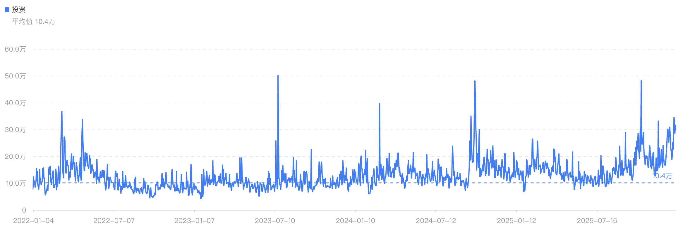 首先看投资这个关键词,从2022年至今的数据来看,投资的热度在逐步走高,当前的热度是明显高于过去正常水平的,近期热度也有明显抬高。