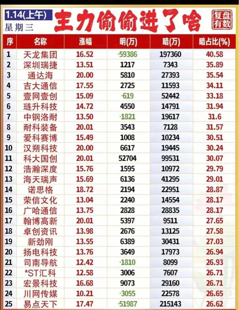 本次梳理个股,涨幅多在10%-20%(含多只20%涨停),暗流占比均超26%。部分个股呈现“明出暗进”特征,标的覆盖传媒、通信、科技等赛道,主力暗线布局迹象显著。