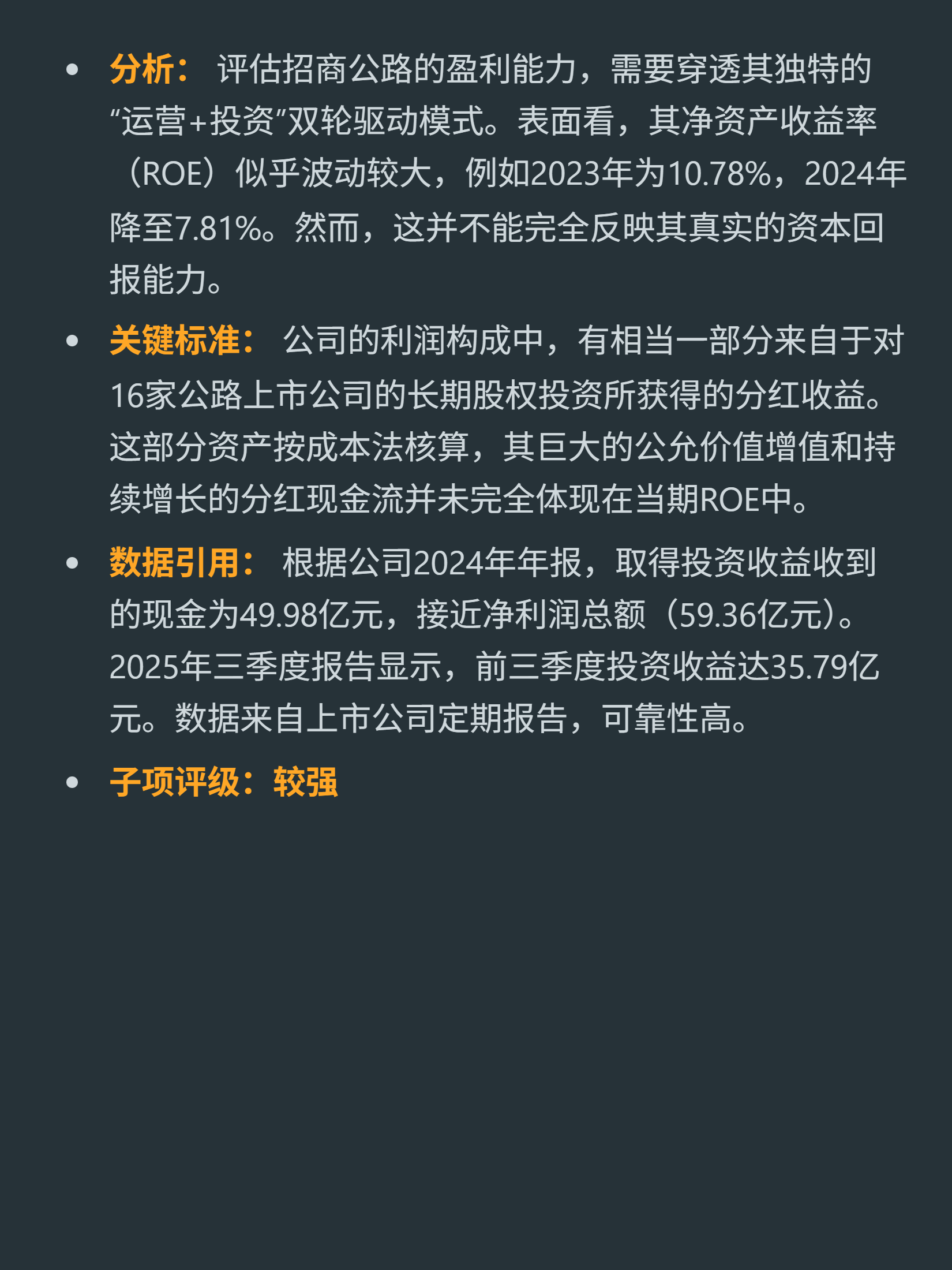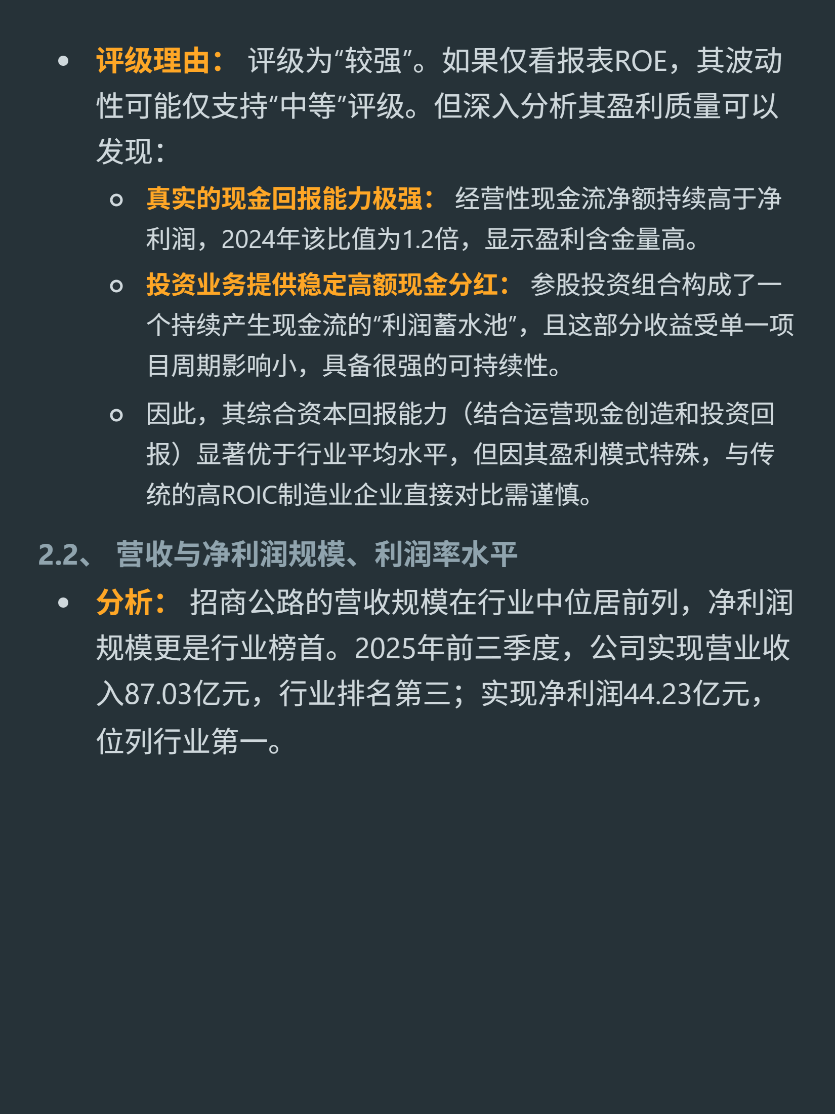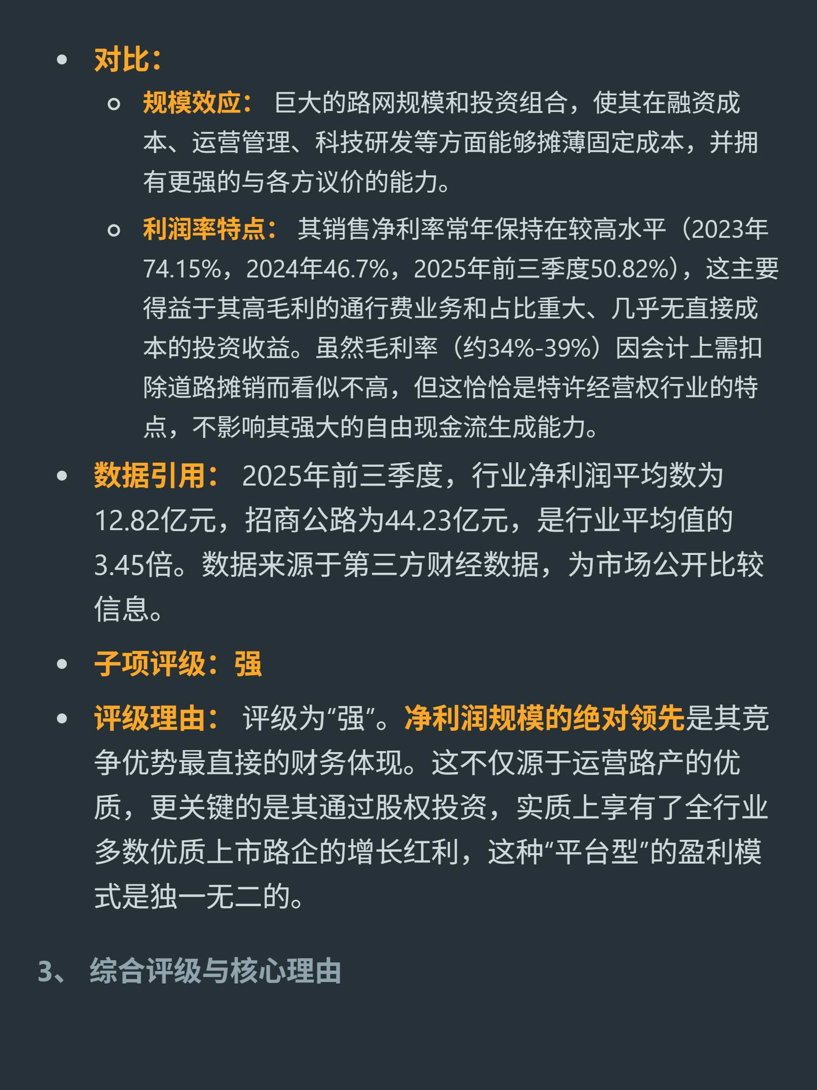 财务亮点:2025前三季度营收87.03亿元(行业第三)、净利润44.23亿元(行业第一,是均值3.45倍);2024年投资收益49.98亿元(接近净利润59.36亿),经营性现金流净额是净利润1.2倍,盈利含金量高;销售净利率常年高(2025前三季50.82%),源于高毛利通行费和无直接成本的投资收益。