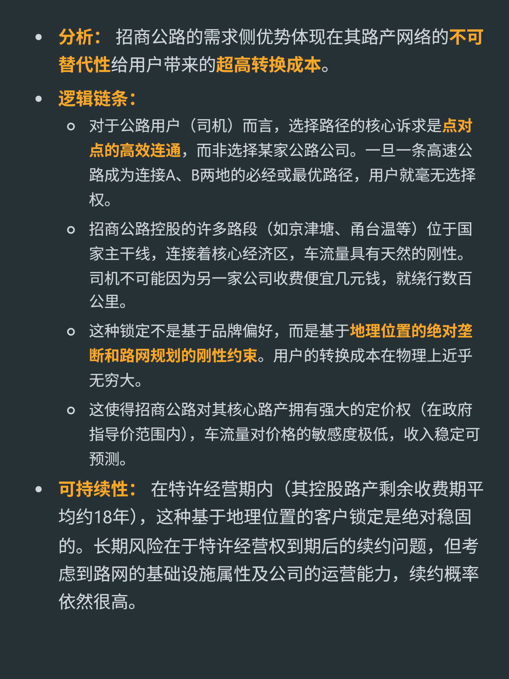 竞争优势:供给侧有央企背景+AAA信用评级,能低成本获取优质路权和资金;需求侧控股路产多为国家主干线(如京津塘),用户因地理位置锁定,转换成本极高;规模经济上,1.4万公里路网摊薄固定成本,参股四分之三公路上市公司,实现信息、管理协同,风险分散。