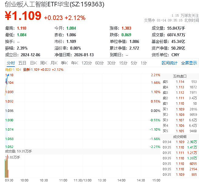 热门ETF方面,同标的指数规模最大、流动性突出的创业板人工智能ETF华宝(159363)场内价格上涨1.84%,成交额达5137.35万元。