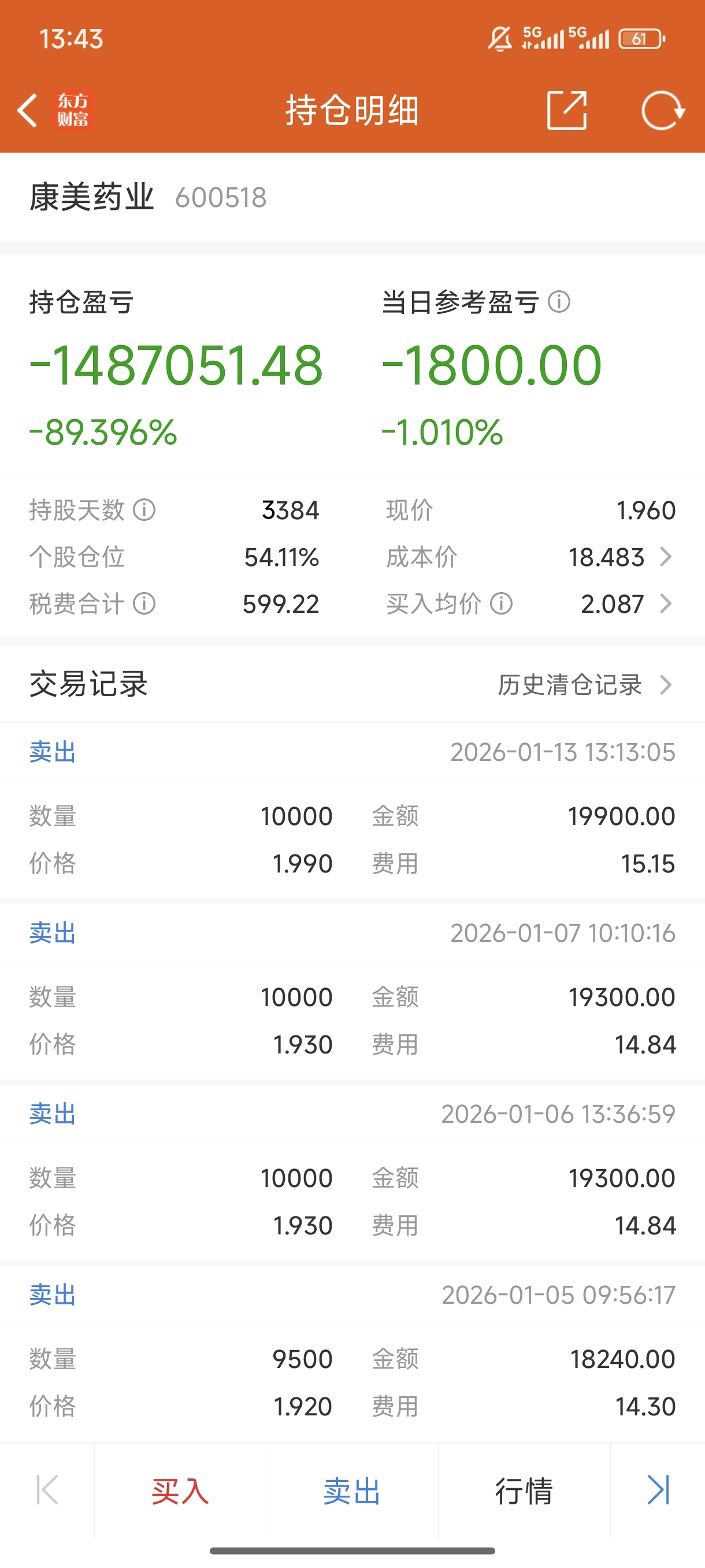 #复盘记录# 这段时间一直在卖的路上,虽然成本成12块钱一直堆高到18块钱,但是卖的越多反而心情越好了,不用被折磨的那么难受,调了六七万出去做了短线,半个月也有一万多的收益,有时候在寻思坚持这么多年,拿着它的意义是什么?是看好它的智慧药房,还是看好背后广药,还是看好中药市场的行情。说实话可能就是心底的那个不甘心,不愿意承认自己坚持这么久会一无所获。但是事实就是如此,大盘2800点康美1.9现在大盘4100点它还1.9,很难想象大盘如果重新回到3000点,那康美是不是会跌到1.5或者1.3这都不是不可能,我们是经历过千股跌停千股涨停的行情的,我们也怕了。但是别人是赚钱了跌回去叫利润回撤,那我们死守着康美的这30万万股东,可以说是分币不挣啊,那到时候就是雪上加霜的亏啊。纵观广药旗下的上市公司,收购入股的都是些杂毛鸟公司,白云山也半死不活,十几年一直20多的价格市值四五百亿不上不下。天天领导带着团队全球美其名曰商业合作,在我看来就是出去吃喝玩乐啊。赖志坚150万年薪,十几个高管加起来2000多万年薪,抵得上330多个员工一年的工资,你要是扣非净利润赚钱了,拿这么多工资我们无话可说,可是你们做了什么,重整那么多年,扣非净利润还是亏损的,想想也是真的搞笑。今天写完这篇文章,也准备这个月把最后的底仓清完了。买康美股票的神经太多了,什么林黛玉,老蔡头,说实话你们天天在这股吧里臆想,真的有点搞笑。快折磨疯了吧?