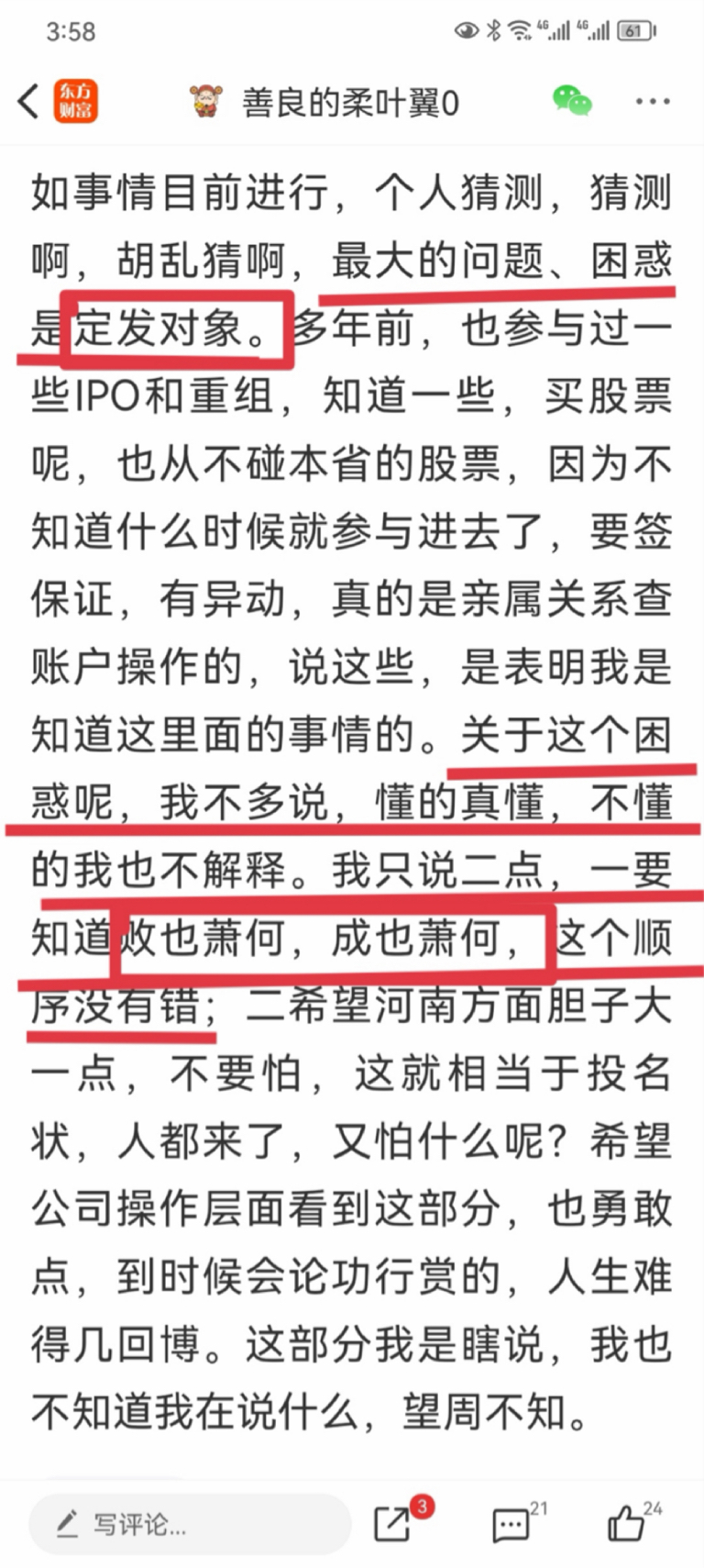 2去年,CJB股东大幅变动,河南方面的持股下降到30多,心里就感觉不妙,然后按照cjb400亿的估值分别在河南60多和30多持股的情况下测算定向增发后河南方面的持股,情况就很不对,然后我的持仓就从1000手降到了500手,成本也就降到了3元左右,后来证明这是对的。