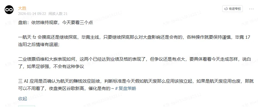 盘后,根据盘面情况我在复盘文《20260113-股票市场专业复盘及投资策略》里回应了这三个问题,咱们一一来看。