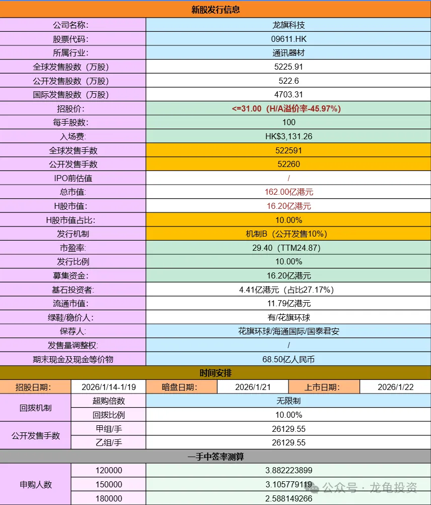 龙旗科技A股于2024年3月在上海证券交易所上市,截止2026/1/14收盘价51.31元,H股招股价31港元计算,H/A溢价率为-45.97%;受豪威和兆易两只新股的赚钱效益影响,龙旗首日孖展表现有点抑制不住的兴奋。