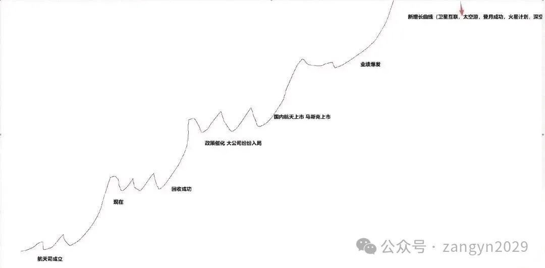 商业航天现在处于第一阶段上涨后的震荡调整阶段,后面核心受益公司还有五到五十倍的上涨空间,现在主要任务是找到商业航天里面的易中天,在震荡调整期间进行布局,不懂的看下图。