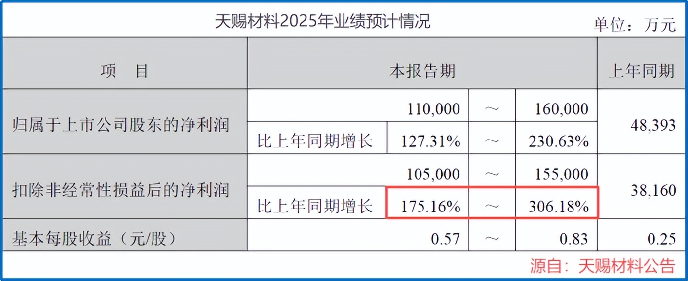 在风云变幻的锂电材料市场中,天赐材料 2025 年的业绩表现堪称惊艳。据业绩预告显示,其全年净利润约为 11 - 16 亿元,相较 2024 年,这一数字实现了 127.31% - 230.63% 的大幅度增长 ,宛如在行业低谷中强势反弹的骏马,一骑绝尘。扣非净利润同样表现出色,约为 10.5 - 15.5 亿元,同比增速更是高达 175.16% - 306.81%,彰显出公司核心业务盈利能力的大幅提升,犹如一把利刃,在激烈的市场竞争中披荆斩棘。