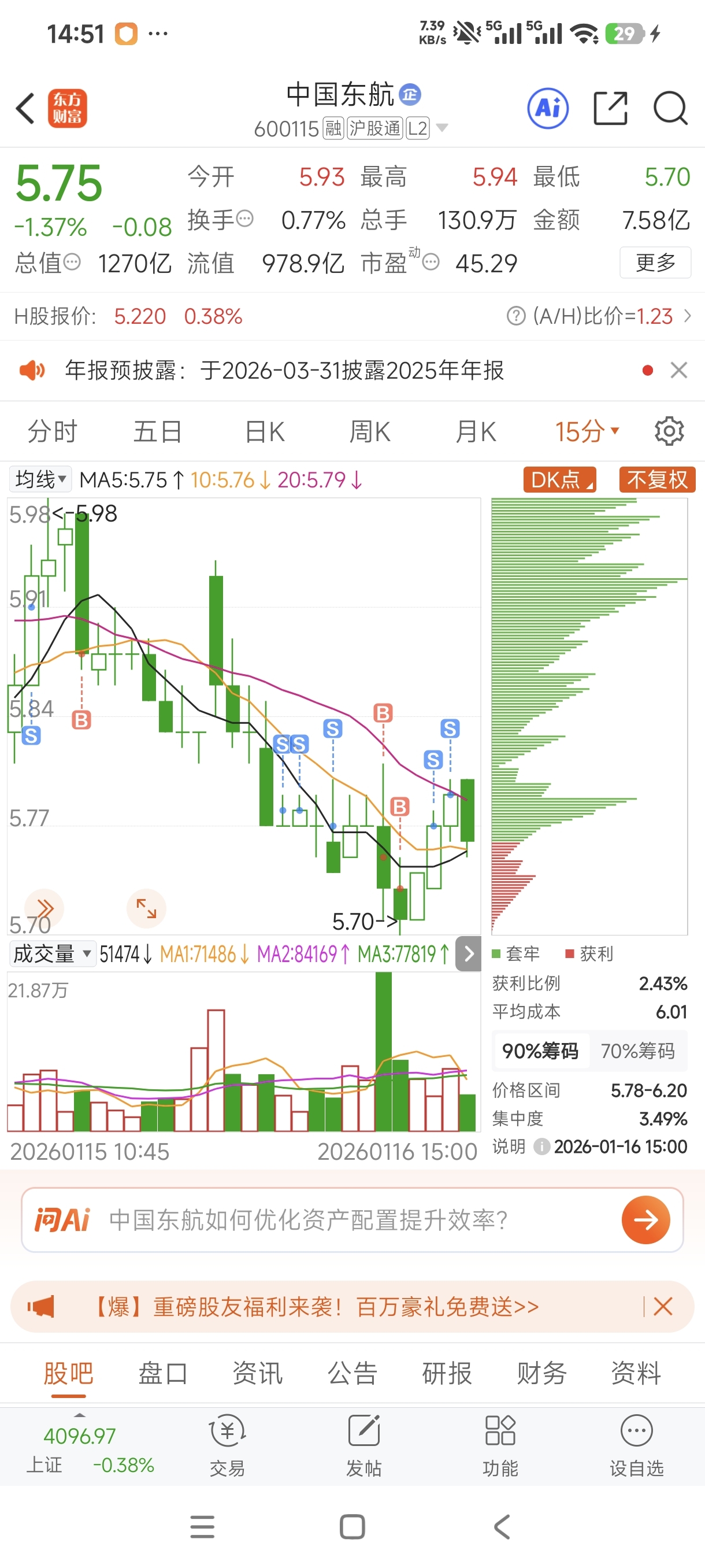 $中国东航(SH600115)$ 到底了,港股还是涨的,今天定义为恶意洗盘,
