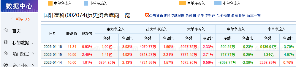 证券之星消息,截至2026年1月15日收盘,国轩高科(002074)报收于40.96元,上涨2.4%,换手率4.02%,成交量69.81万手,成交额28.64亿元。