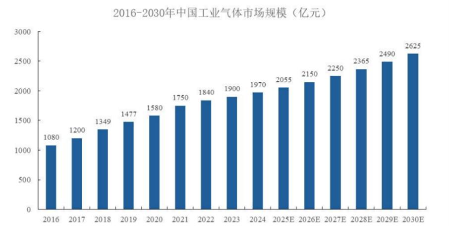 工业气体对中国经济的持续发展有着不可或缺的作用,根据行业数据,我国工业气体市场规模从2017年的1200亿元增至2024年的1970亿元,预计2030年将达2625亿元。随着半导体、新能源等高端制造崛起,电子气体成为新增长引擎,$广钢气体(SH688548)$和$南大光电(SZ300346)$由此站上时代风口。