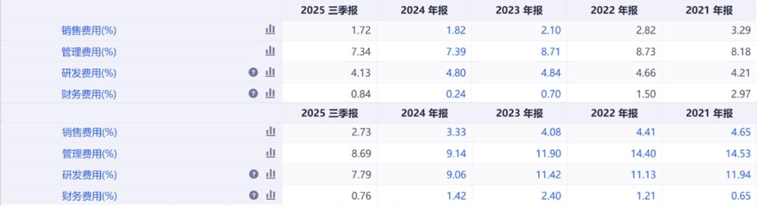 南大卖的是芯片级试剂,天然具备高溢价能力,39.66%的毛利率在行业中遥遥领先;而广钢的26.71%毛利率,已是从2022年38.27%高点回落后的企稳结果,主要受氦气成本波动和新项目折旧拖累。但广钢并未坐以待毙,通过精细化运营,将期间费用率(含研发)从2021年的18.65%压降至14.03%,稳住了利润基本盘。