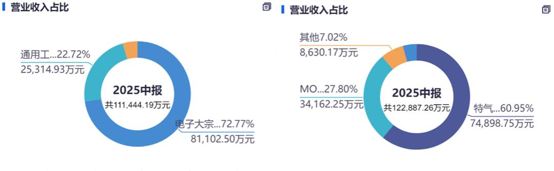相比之下,南大光电聚焦于电子特种气体与半导体专用材料。它的产品不走管道,而是装在特制安瓿瓶中,被小心翼翼送入光刻机或MOCVD(金属有机化学气相沉积系统)设备。2025年上半年,特种气体贡献60.95%营收,MO源占27.80%,光刻胶及配套材料占7.02%。可别小看这7%,它背后正是国产ArF光刻胶从0到1的关键突破。更关键的是,MO源以50.37%的超高毛利率,正逐步提升在营收中的比重,显示公司正主动向价值链顶端攀爬。南大的独特优势,在于同时横跨电子特气与高端材料两大高壁垒领域,构建了难以复制的护城河。