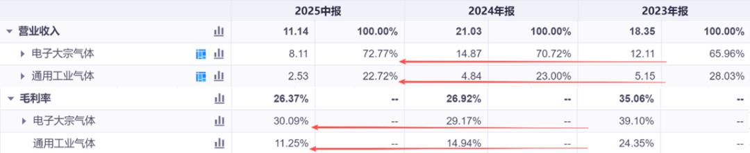 在这个框架下,广钢气体主攻电子大宗气体与通用工业气体。目前其72.77%的营收来自电子大宗气体,22.72%来自通用领域。当你走进一座晶圆厂,或许看不见广钢的名字,但它的氮气管道早已深埋地下,像城市供水系统般默默支撑整座工厂运转。尽管这两类业务毛利率相比2023年均下滑了10个百分点左右,公司仍坚定向高毛利的电子端倾斜,30.09%对11.25%的利率差距,战略选择不言自明。这种由粗转精的路径,让广钢从区域供应商蜕变为半导体产业链的基础设施提供者。