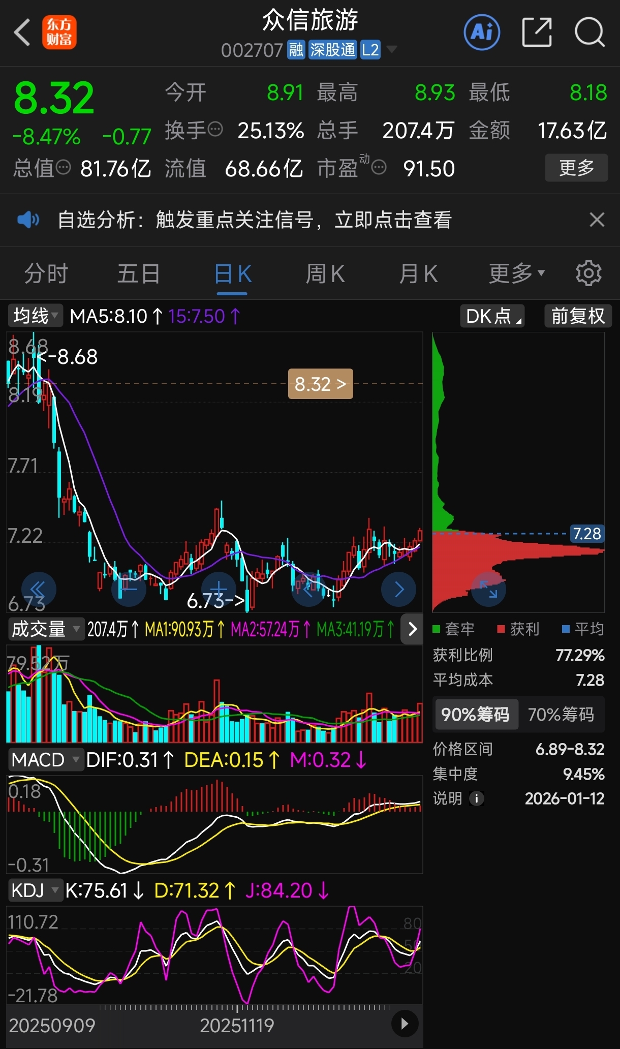 $众信旅游(SZ002707)$ 众信旅游在上涨前,获利率仅有77.29%,这意味上方有那么大一坨,到了筹顶大概率会暴力洗盘,非暴力无法振落上方筹码。前面三天解套盘会走掉一部分,今天又会走掉大部分。 但是,尽管今天价格远高于三日之前,获利率却比三日前还低了,只有69.64%。这说明,浮筹大多数被套牢。这些浮筹不见得是散户的,因为散户经不住涨,也经不住跌,已经魂飞魄散。这些浮筹主要是各路主力的。下周一主力们齐心协力拉起来,则顺利打开上升空间。然后连板拉升,跨年大牛股就成了。