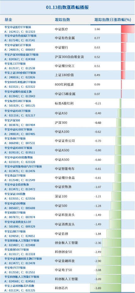 以下是宝儿姐家主要指数基金跟踪指数的涨跌幅情况: