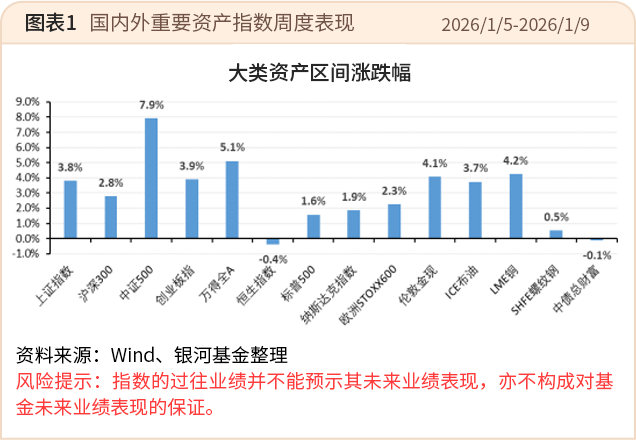 Wind数据显示,2026年第一周,全球风险偏好同步上行,市场增量资金入场,大盘放量突破4100点,创近10年新高;市场板块分化态势加剧,部分新兴产业主题投资活跃度提升,成长风格表现相对突出,中盘风格宽基指数表现居前。不同板块间表现差异明显,成长类板块整体走势较强,金融类及传统消费类板块整体走势相对平缓。Wind数据显示,统计区间内,上证指数涨3.8%,沪深300涨2.8%,创业板指涨3.9%,万得全A涨5.1%。