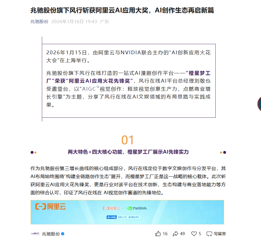 在兆驰涨停的时间点,我发帖说兆驰行情没结束,上涨不是因为光模块、光芯片、业绩,因为这些目前都看不到,唯一能看到的就是AI应用,也就是与阿里云合作的风行,之后第二天股价接近跌停,跌停也未改变对之后行情的判断,也就是AI应用没结束,风行目前是盈利的,同时真正跑通了从创意到变现的商业闭环,最高播放量已突破5000万,这不是导入期概念,是真正的应用成长期,AI应用行情结束后,应该会有股价回调,同时就需要看年中的光模块小规模放量情况,还会有一波行情,26年下半年看点就是光芯片和光模块业绩提升占比的行情,这个时间段的行情是兆驰最有看点的行情,目前就是看AI应用的发酵,等待易点天下复牌的市场情绪,很多股民对光模块那么大期望,还有臆想摩尔线程、星际荣耀股权的,节奏错了想法错了,务实一点不要欺骗自己,看好兆驰,也要立足当下,目前就是AI应用,26年中、下半年是光模块和光芯片的爆发,27年是兆驰的业绩年,看短期的、喜欢做梦的,放量高了赶快卖,不然兆驰回调你留不住的!
