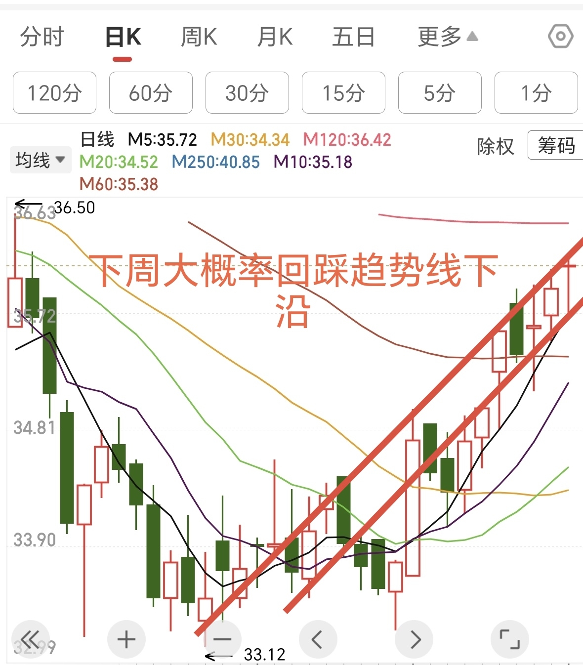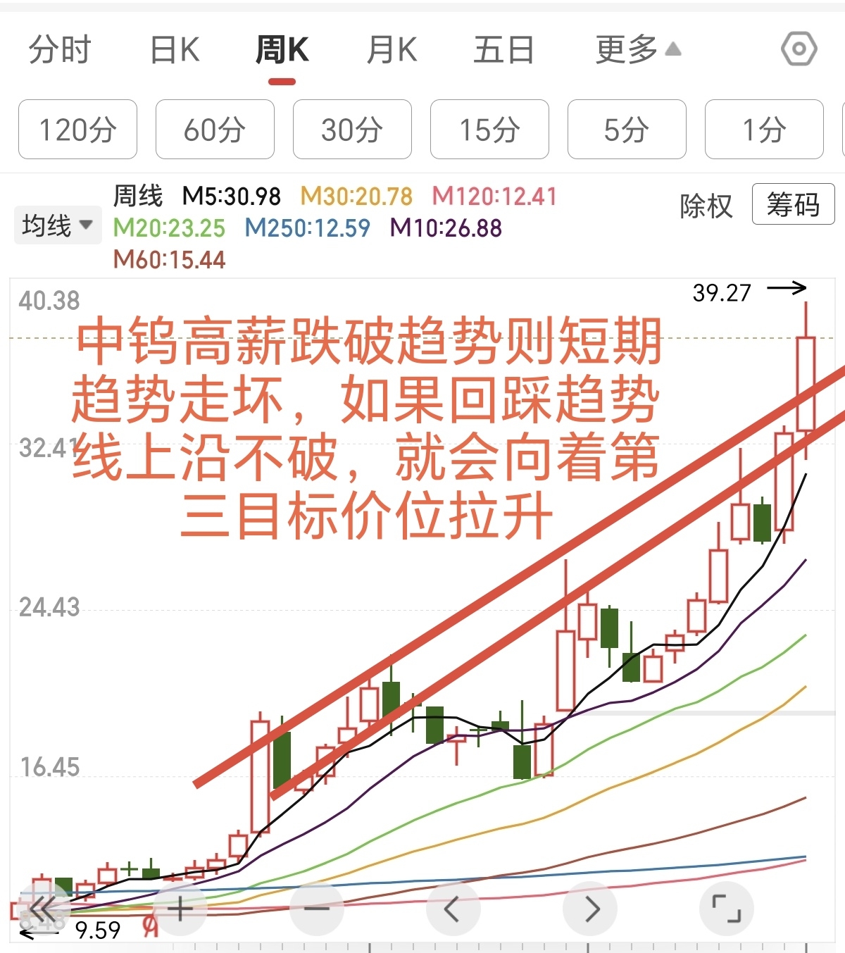 中钨高薪第二目标价位36.1 波动上沿37.6 波动下沿34.6 由最高39.27 可知中钨高薪已经进入到了第三目标价位拉升中,由于量能没跟上所以向下震荡蓄势,收盘价在37.5 所以周一有一定概率回踩36.1,如果股价跌破波动下沿34.6 那么趋势就走坏了,也就是追涨被套的朋友至少短期内很难解套了。