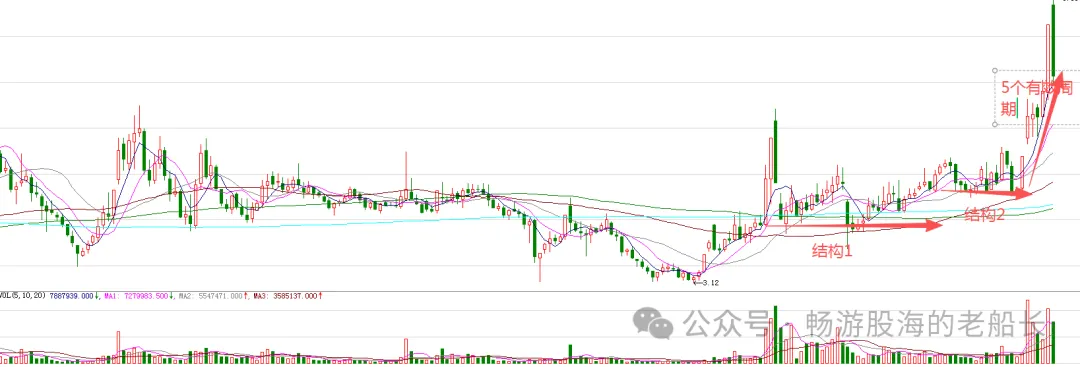 图中标注的大型中枢结构1意味着股价处在比较大的上涨趋势。结构2是结构1的延伸,是为了蓄势突破结构1.结构2突破,意味着波段上涨开始。由于结构规模比较大,所以,股价依然处在上涨趋势。本次调整结束后,股价大概率还会继续波波上涨。