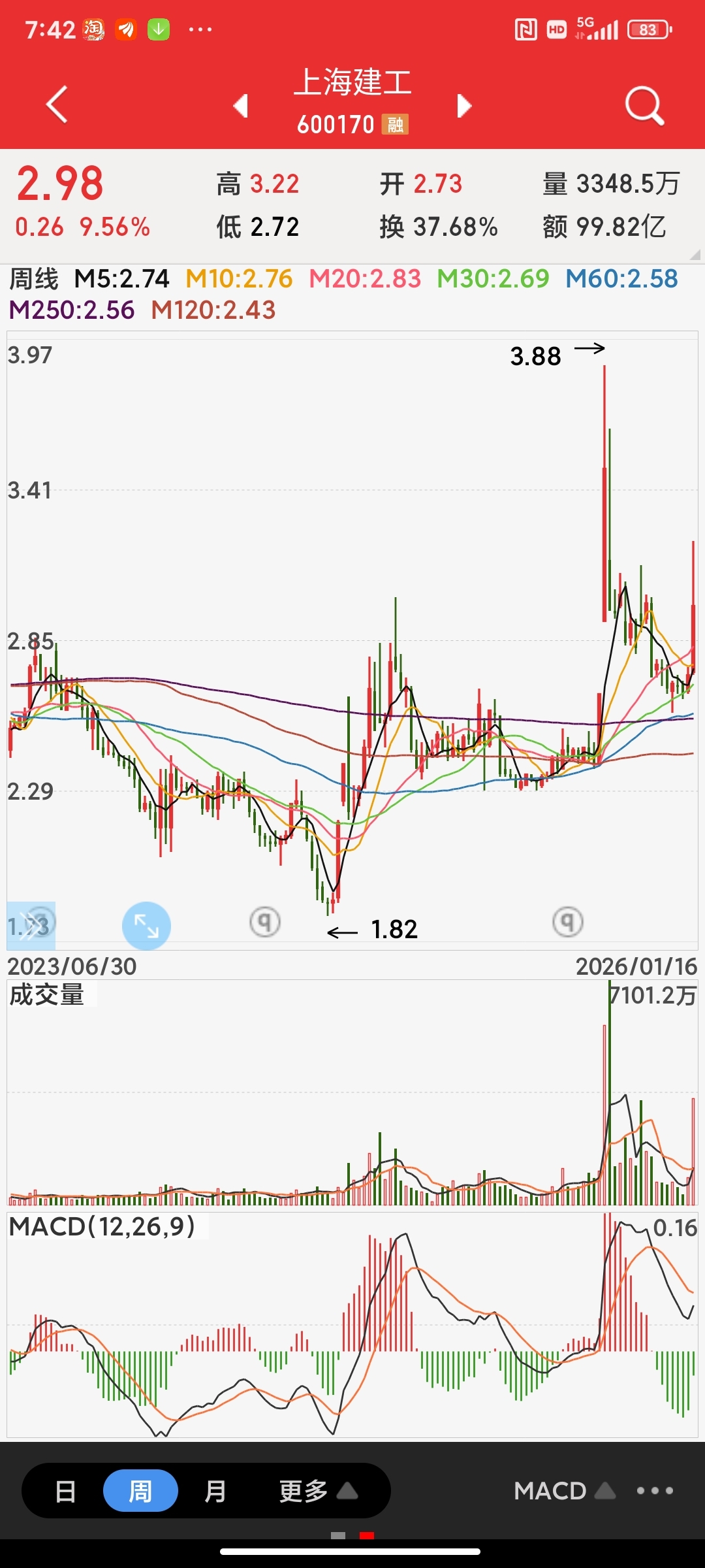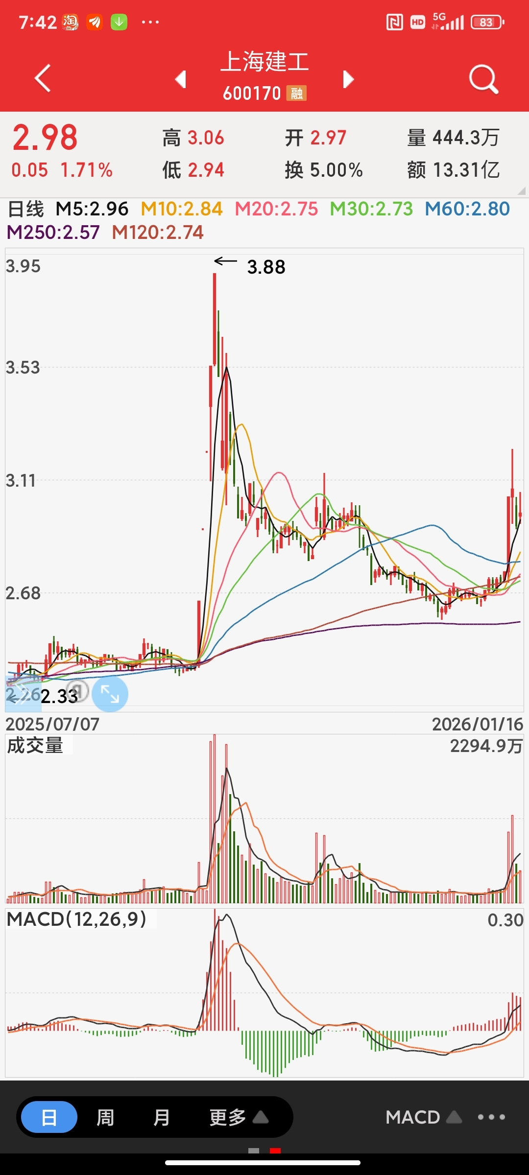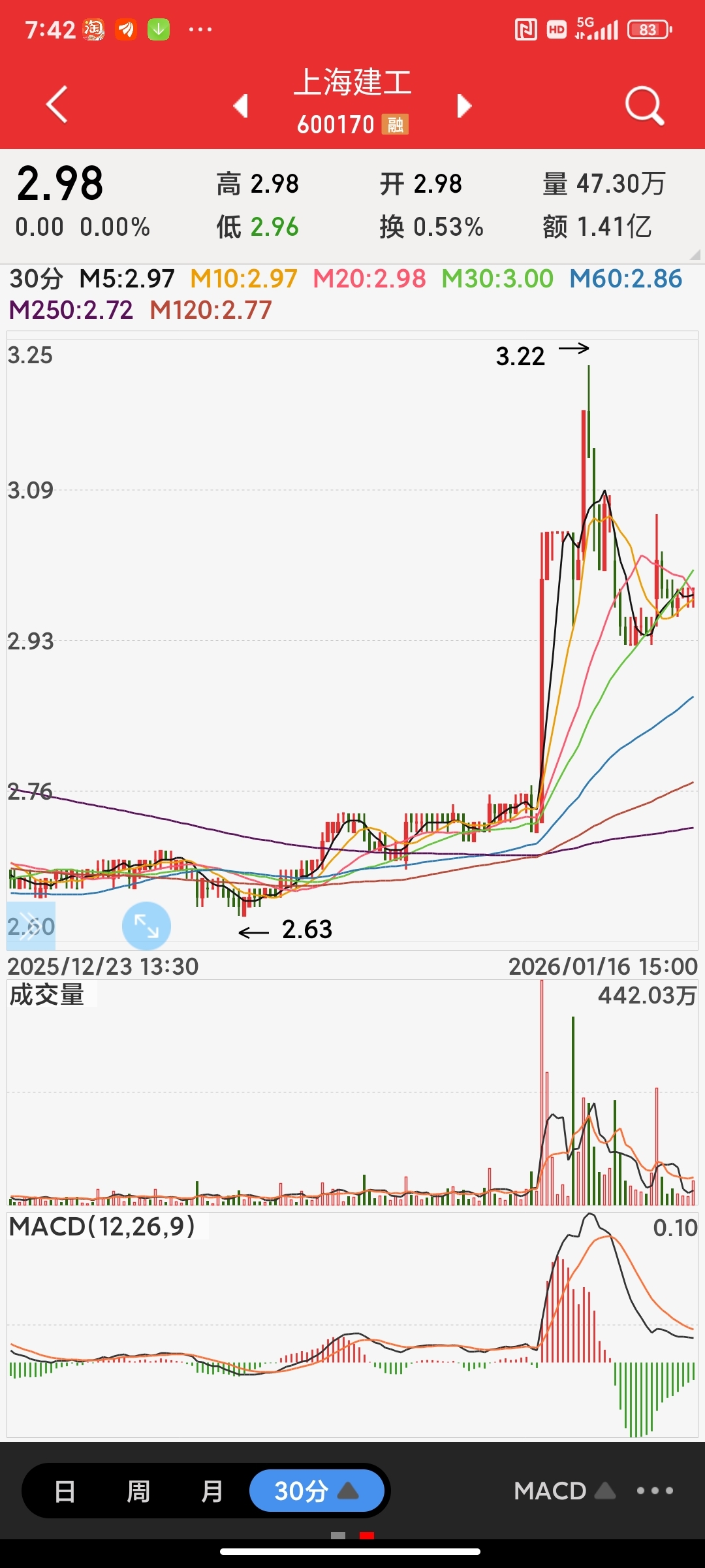 四张图讲解一下建工走势。。首先月线金叉周线死叉日线金叉30死叉。。。从月线角度看。。要想月线回调。。那么就要月线死叉。或者周线做顶背离。。如果周线做顶背离那么就要突破388才能行成顶背离。所以从月线角度看388那里会被突破。。目前日线金叉30回调322那个位置没出顶背离。。日线没死叉意味着30金叉后有突破322走势。。如果突破322做30顶背离。那么有可能走出日线回调做底背离走势。。如果突破322放量持续拉升就可能走出直接拉周线金叉突破388走势。。。这个是建工后面可能发生两种走势。。30分级别看。。30没金叉5分没底背离。那么如果做5分底背离就要跌破292一次做出底背离然后拉30金叉后突破322。。如果强拉30金叉那么就不做5分底背离。。。30金叉位置是加仓做t点位。。加仓后过322卖出加仓的。。这个是短线做t思路。