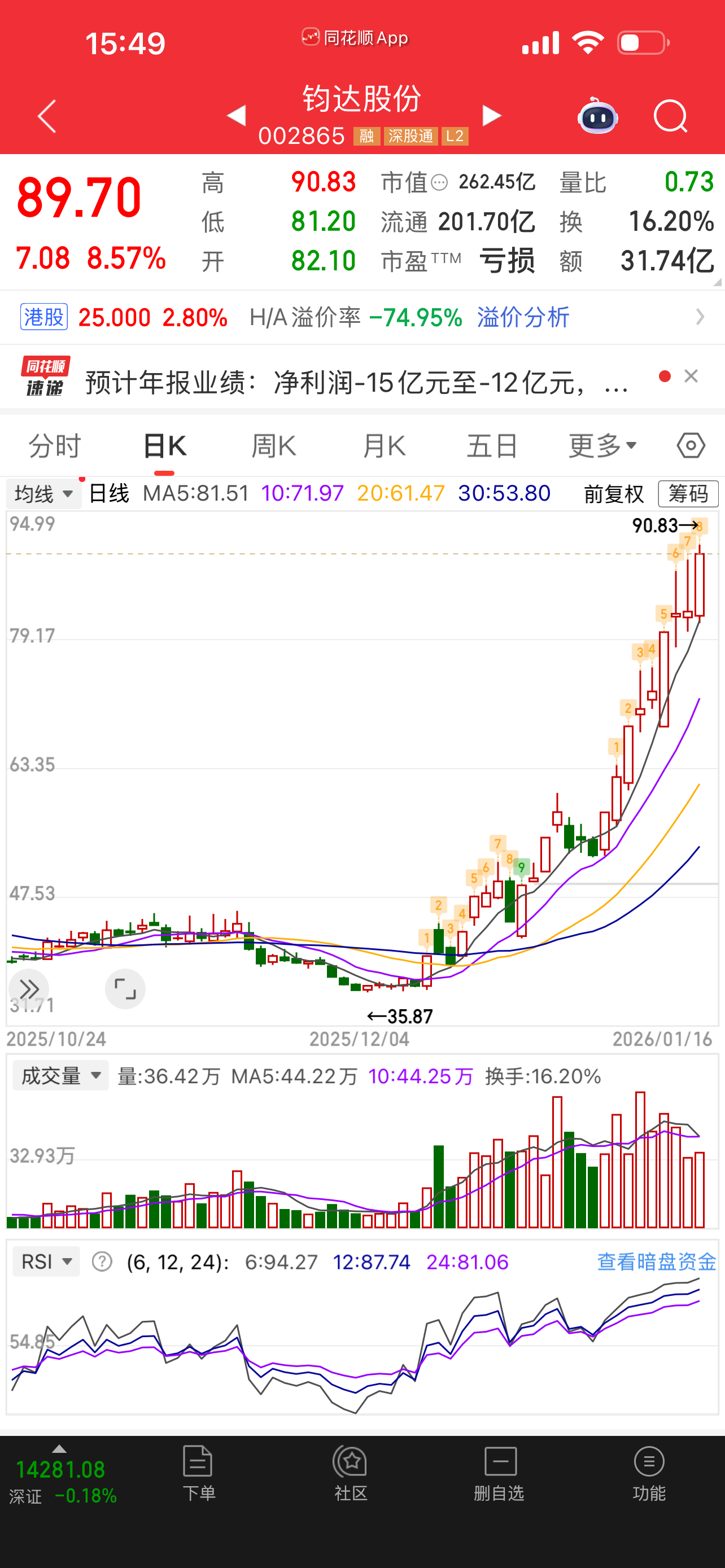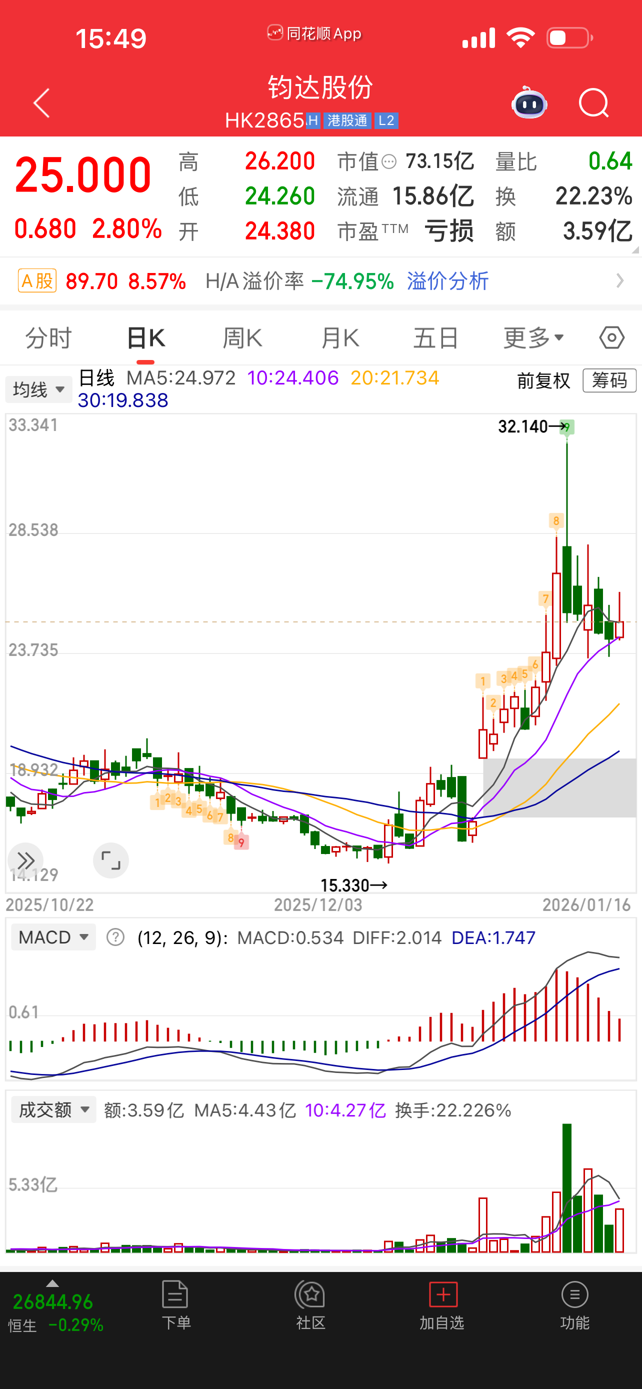 截至 2026 年 1 月 16 日收盘,钧达股份 A 股(002865.SZ)89.70 元,港股(02865.HK)25.0 港元,按汇率折算 A 股较港股溢价约70%+,核心源于市场分割、估值逻辑、流动性、交易机制四大差异,叠加公司自身业绩与上市节奏影响。