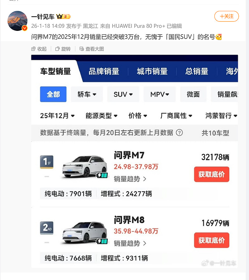 问界M7去年12月实际上险量32178台,M7+M8单月上险量超5万台