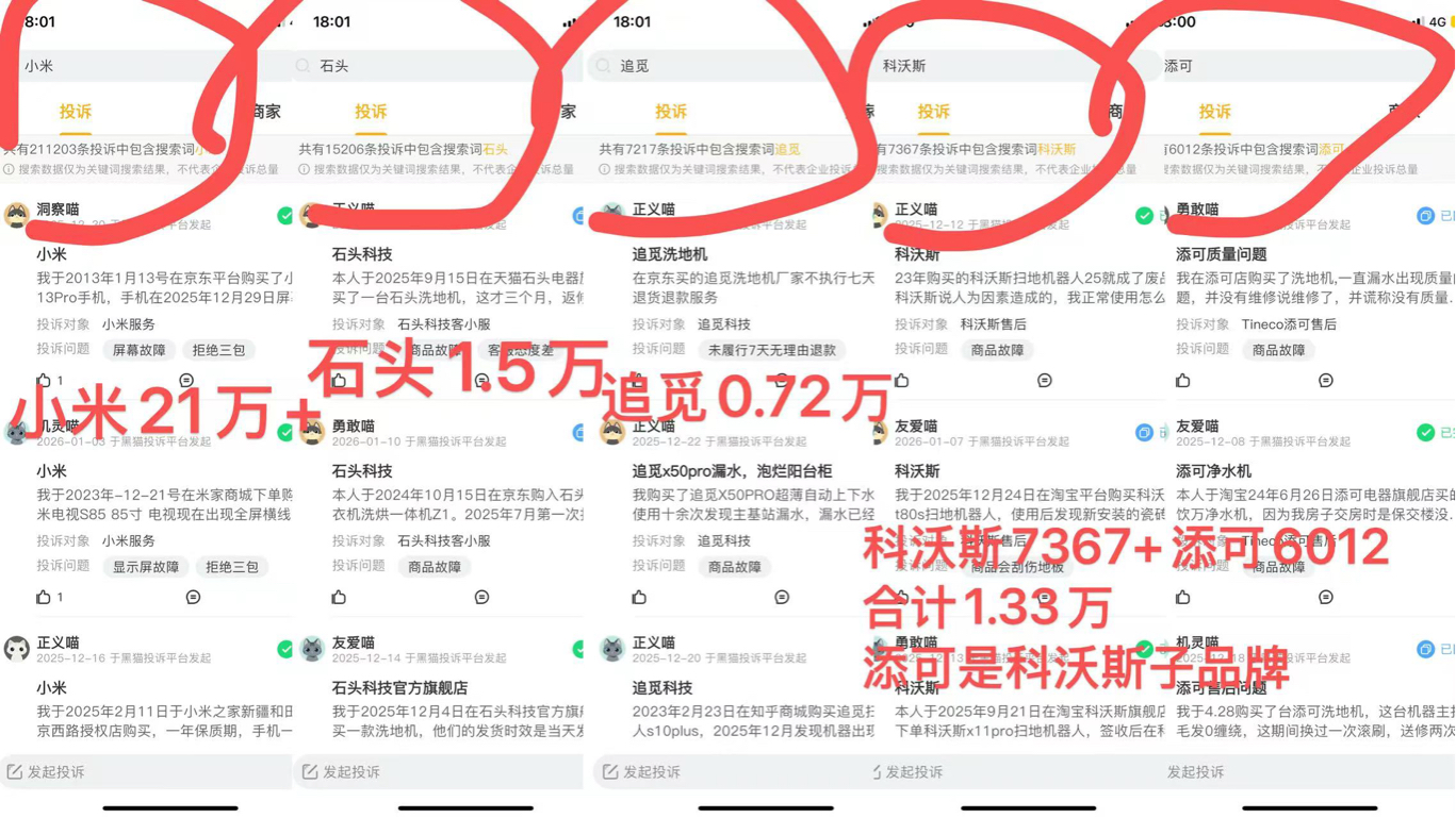 小米营收追觅10倍多 +去了汽车大概7-8倍 , 投诉30倍 确高一些了,