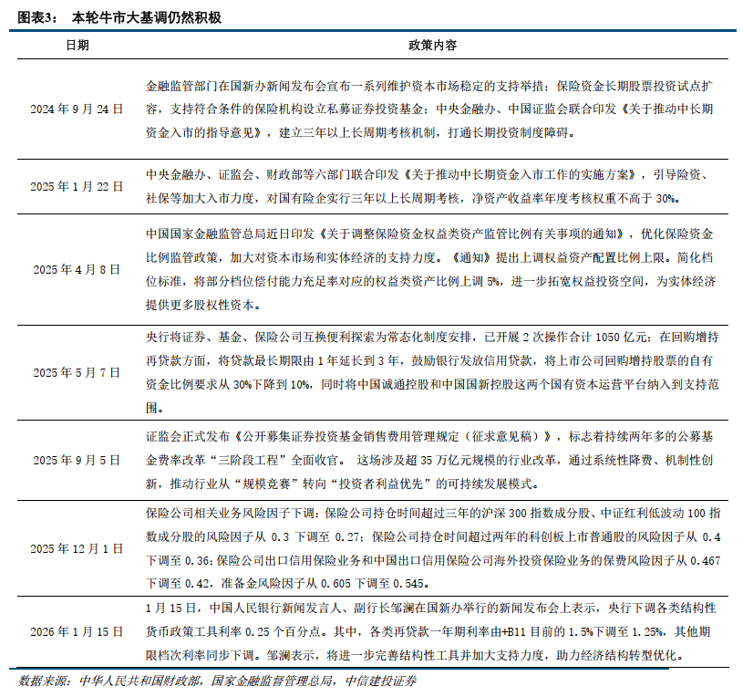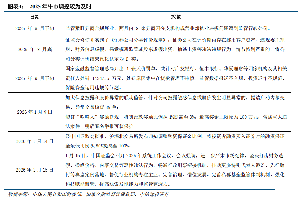 本轮牛市自924以来资本市场政策的大基调仍然积极。每隔一段时间就会有一些长期性的政策来维持整个资本市场的资金入场节奏,例如2025年12月的保险资金风险因子提高、2026年1月的货币政策工具利率下调0.25个百分点等。因此本次主动降温并不改变大基调,而是为了调控牛市节奏。