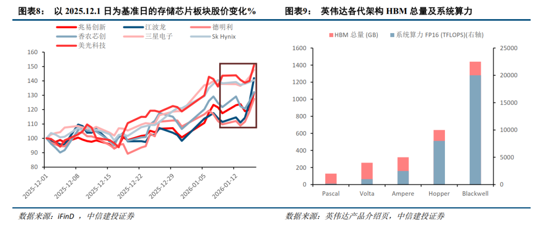 从产业层面观察,随着英伟达GPU架构由Pascal、Volta、Ampere向Hopper、Blackwell演进,单卡HBM搭载容量与系统算力同步大幅提升,存储在AI系统中的配置权重持续上移。尤其在最新一代架构中,HBM容量与算力呈现同步跃升趋势,高端存储已从“配套部件”逐步转变为 算力系统性能释放的核心约束之一。这一变化在近期市场定价中开始得到更直接的反映。