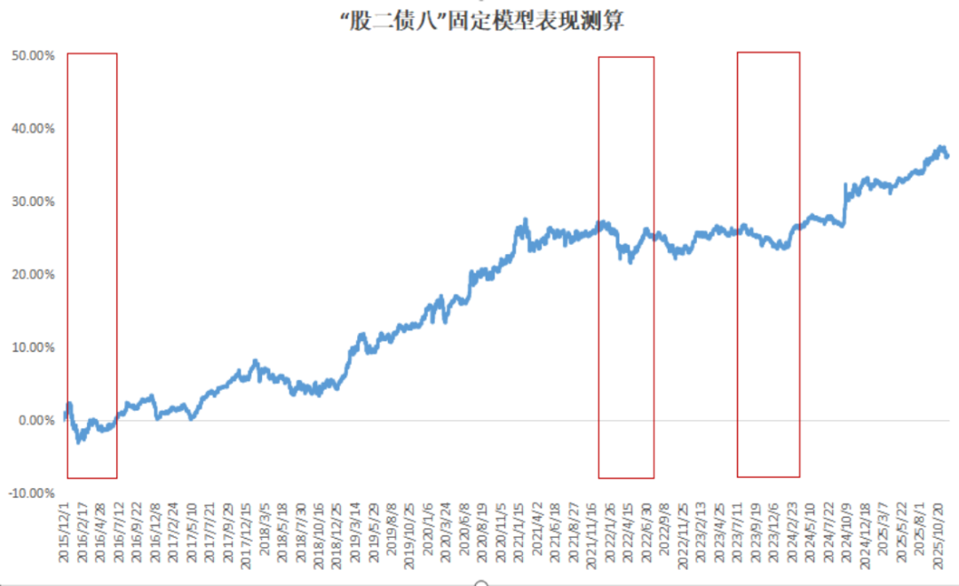 为验证其表现,我们搭建了一个简化的“股二债八”模型进行测算(假设债券部分对标中证全债指数,股票部分对标万得全A指数)。结果显示,该模型虽能提供长期增长的净值曲线,但在市场风格切换的关键节点,其收益弹性和风险控制能力均显不足。