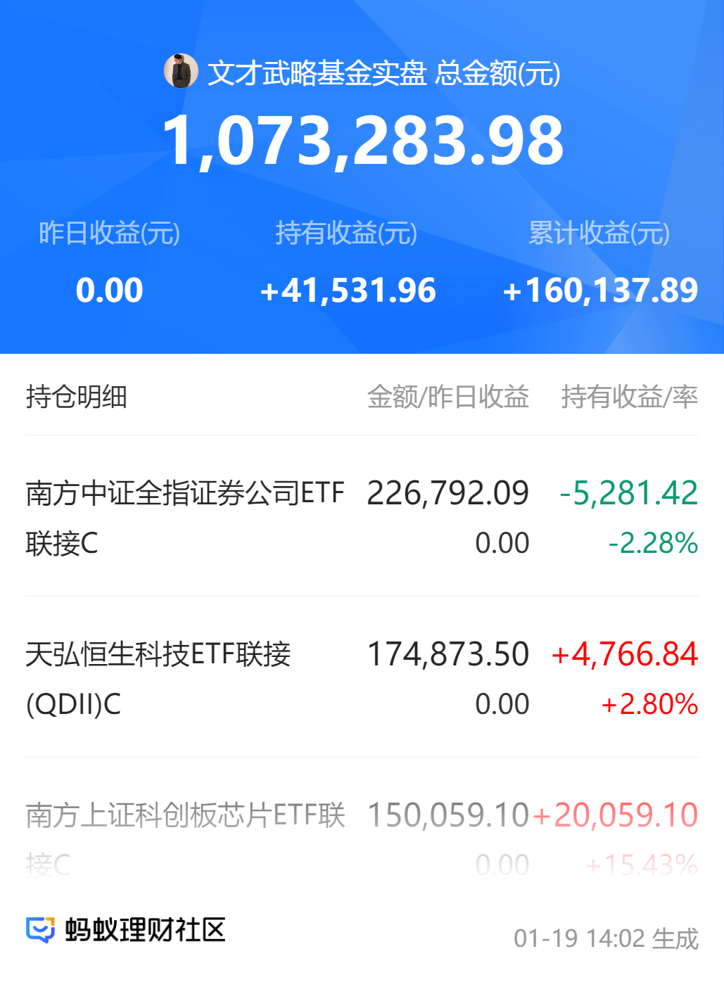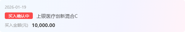 创新药有回踩,上一个创新药,捡些廉价筹码,加仓上银医疗创新混合C10000元,这只是港股和A股的优质创新药标的,目前来说的话,从板块轮动和2026年的医药政策端来讲,创新药也是全行业全链条重点的扶持对象,随着人口的老龄化增加,各种新药的需求加大,AI医疗的加码,从需求端反馈到业绩端,在多重因素的驱动下,我看好创新药市场的修复,所以今天加一个上银医疗创新混合C1万元,港A创新药打包买入。