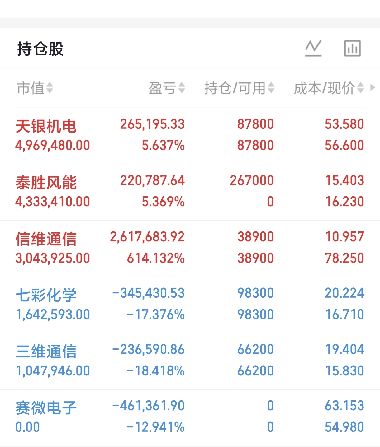 目前持有:天银机电 泰胜风能 信维通信 七彩化学 三维通信。