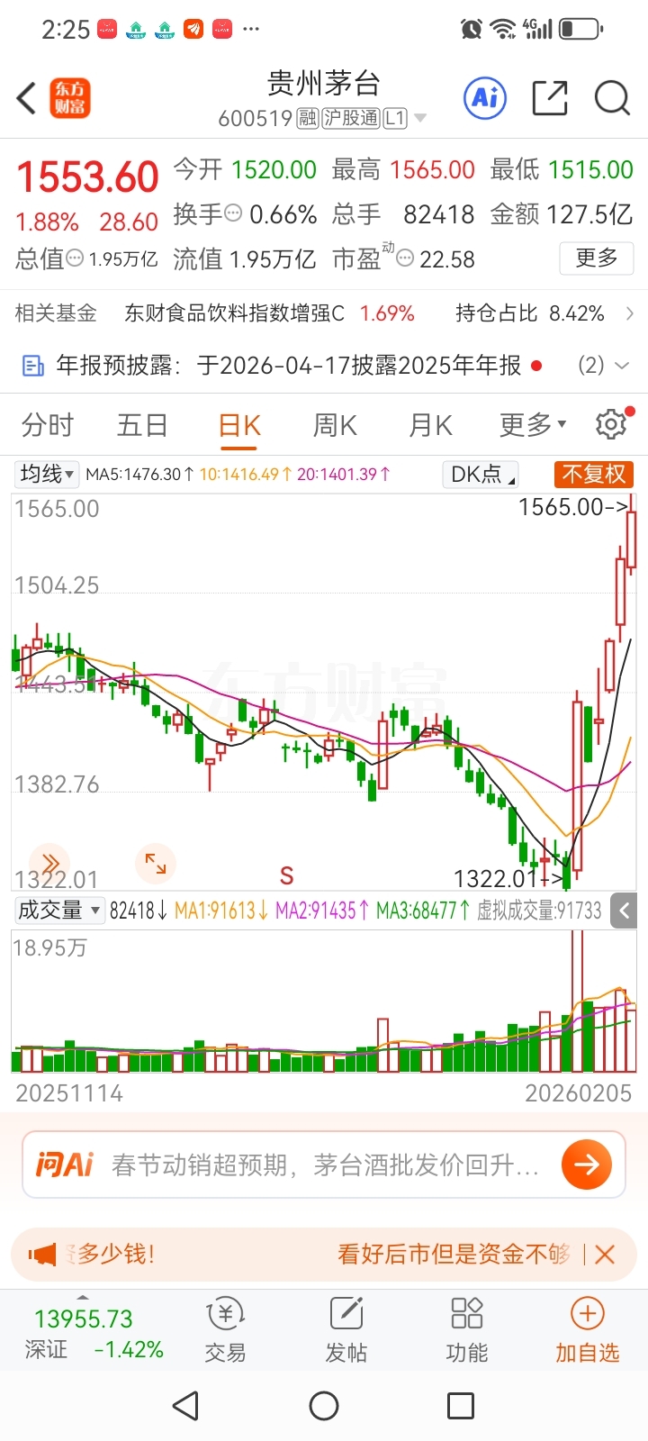 一、今日手痒又买一手贵州茅台,成交价1380元,永远不要预测股价的底部,上次还说不到1400来。预测股息4%