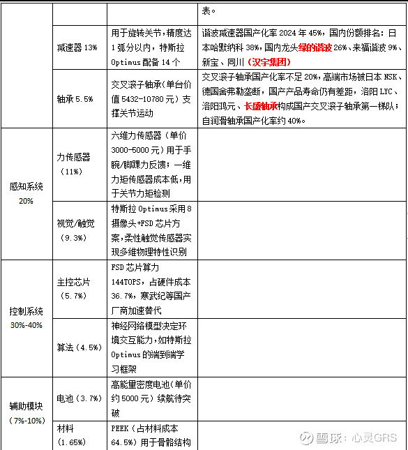 根据《2024人形机器人产业链白书》及特斯拉Optimus Gen2、小米CyberOne等产品数据,核心零部件价值量占比及国产化率如下: