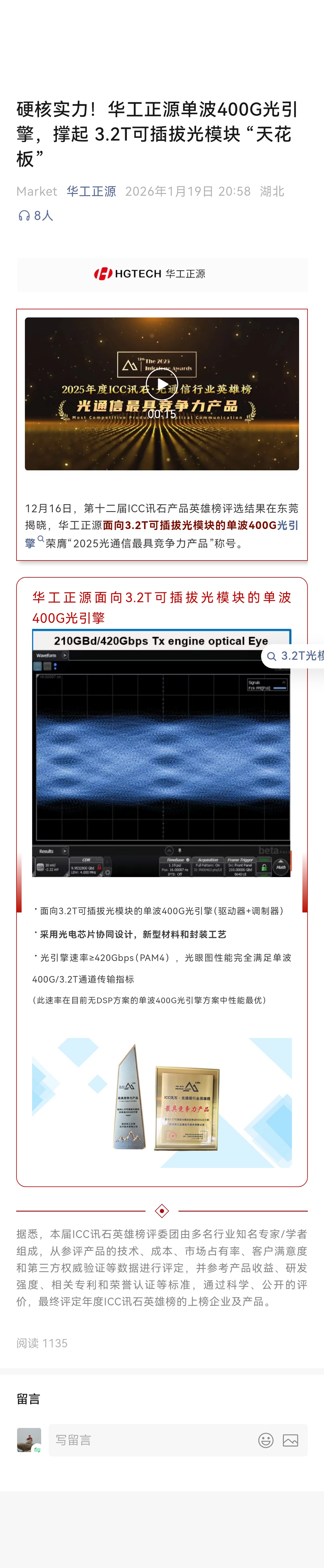 12月16日,第十二届ICC讯石产品英雄榜评选结果在东莞揭晓,华工正源面向3.2T可插拔光模块的单波400G光引擎荣膺“2025光通信最具竞争力产品”称号。
