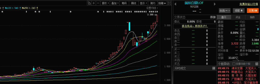 国投白银:积少成多,聚沙成塔,上周五股价再创历史新高,虽然限购100元,但溢价率上升至30%+,一个账户每天到账20+大洋,百户候的福利,猪脚饭根本就吃不完。