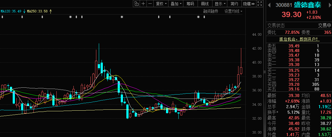 盛德鑫泰昨日受到资金青睐,盘中大涨7%,今日开盘继续上行,不仅收复11月的失地,还突破区间上轨和前期高点的压力,打开新的上行通道,恭喜上车的DD吃肉。