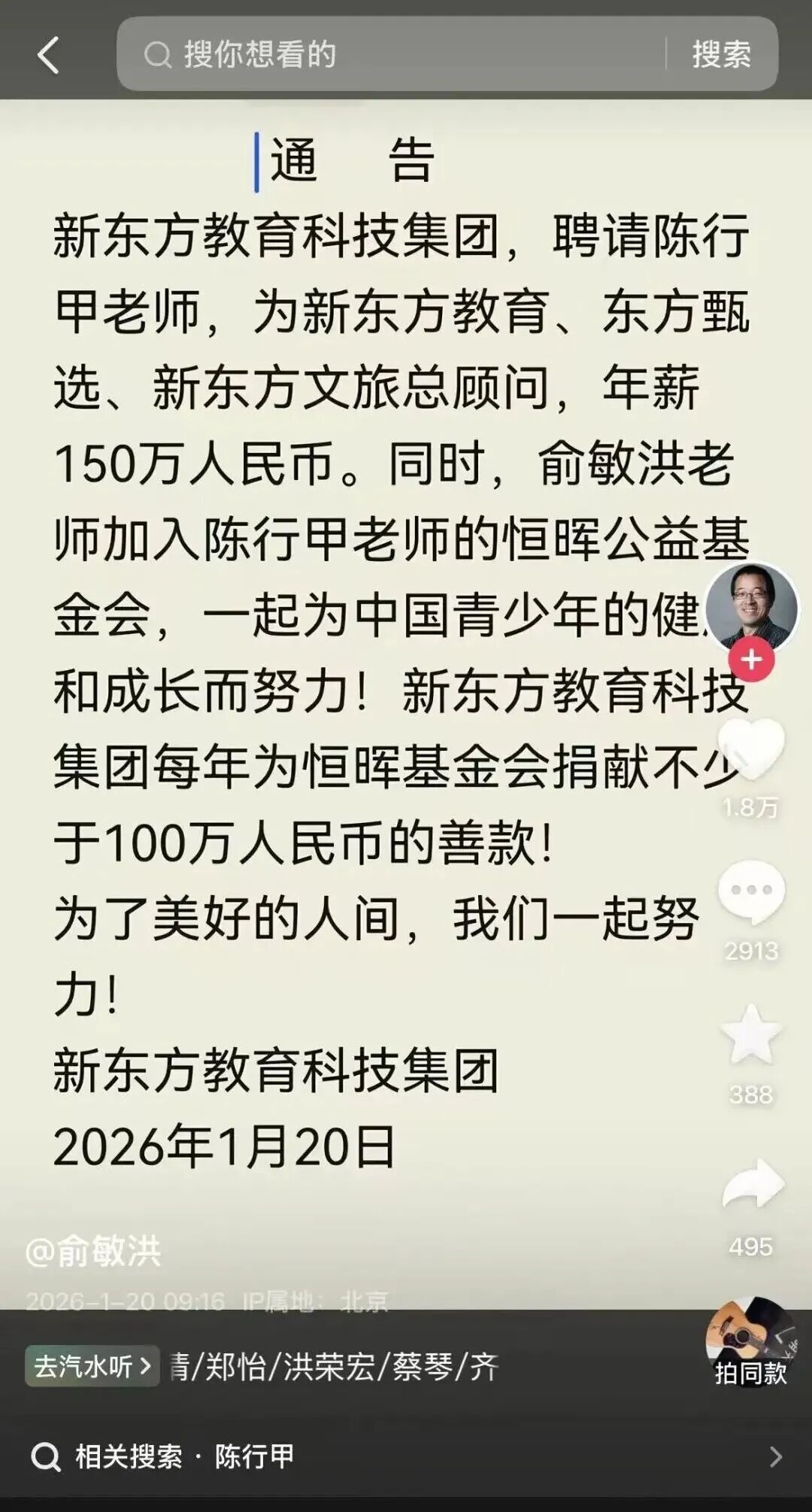 1月20日,新东方创始人俞敏洪在自己个人抖音号,以新东方教育科技集团名义发布了一则通告:“新东方教育科技集团,聘请陈行甲老师,为新东方教育、东方甄选、新东方文旅总顾问,年薪150万人民币。”