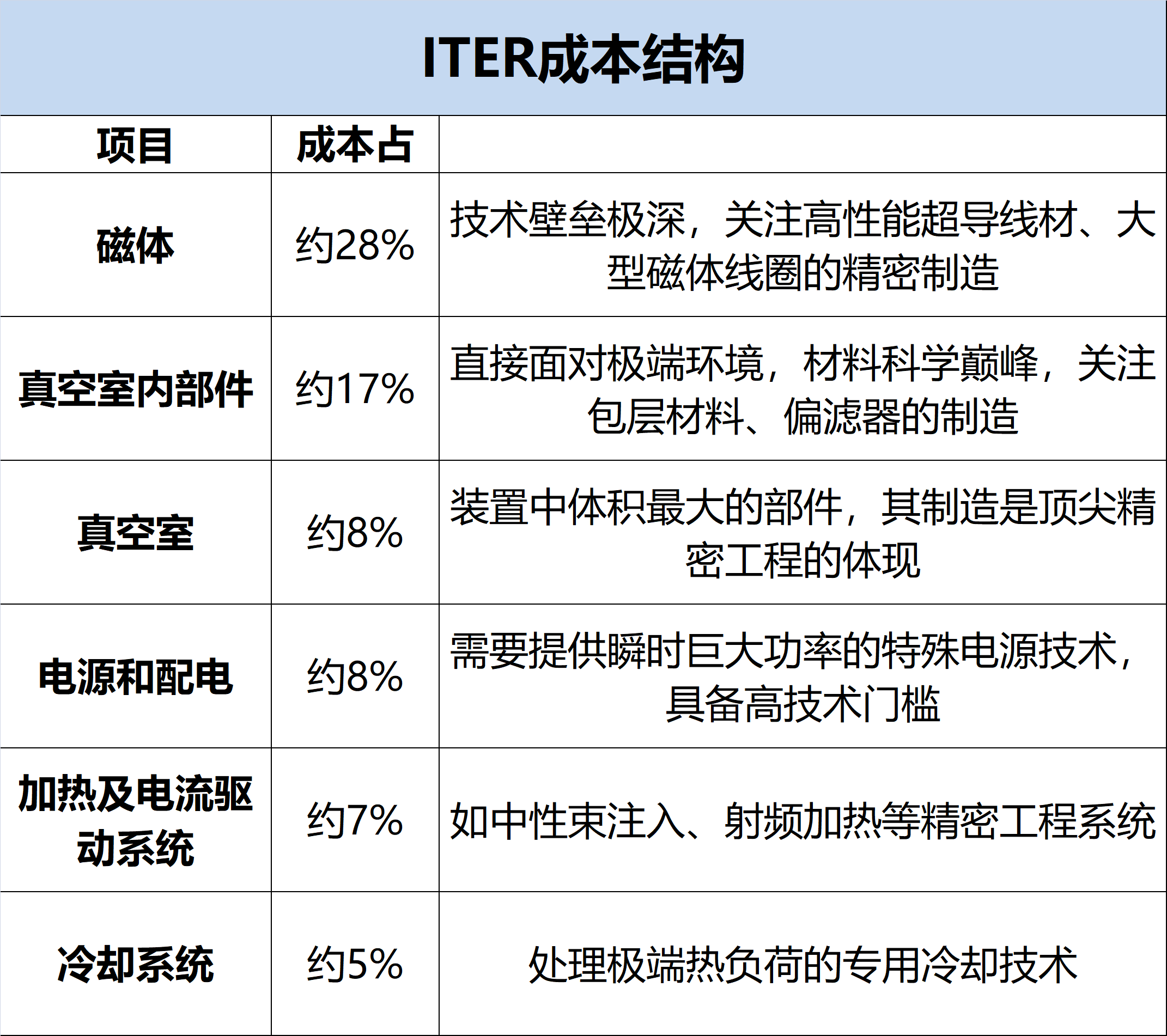 以国际热核聚变实验堆(ITER)为例,在ITER的成本结构中,磁体系统全链条价值最高,占28%,真空室内构建占17%、电源占8%等,这些都属于高技术壁垒及高价值集中区。