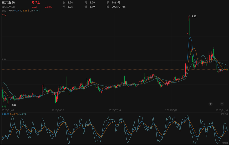 二级市场方面,2025年以来,三元股份股价始终在4元/股至5元/股左右震荡,直到11月,受奶皮子糖葫芦概念影响,公司迎来大幅走高。11月13日,三元股份股价走出四连板,当天收报7.28元/股(不复权,下同),市值一度被推高至110亿元。此后,公司股价回调,截至2026年1月19日收盘,该股报5.25元/股,市值较高点回撤约28%,为79亿元。