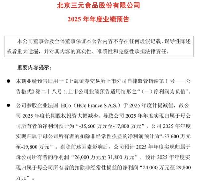 三元股份方面表示,业绩由盈转亏的主要原因是公司参股企业法国HCo(HCoFranceS.A.S.)于2025年度计提商誉减值,导致公司长期股权投资账面价值预计减少4.96亿元至6.16亿元。剔除上述因素影响后,公司归母净利润预计为2.60亿元至3.18亿元,同比增长374%至480%;扣非净利润为2.40亿元至2.98亿元,同比增长705%至899%。