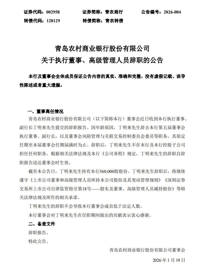 【青岛农商行:因年龄原因,执行董事、副行长丁明来辞职】1月19日,青岛农商行发布公告指出,该行董事会近日收到该行执行董事、副行长丁明来提交的辞职报告。因年龄原因,丁明来辞去青岛农商行第五届董事会执行董事、副行长,以及董事会风险管理与关联交易控制委员会委员等职务,其原定任期至本届董事会任期届满时为止。辞职后,丁明来不在青岛农商行及该行控股子公司担任任何职务。根据相关法律法规及青岛农商行《公司章程》规定,丁明来的辞职自辞职报告送达董事会时生效。$青农商行(SZ002958)$