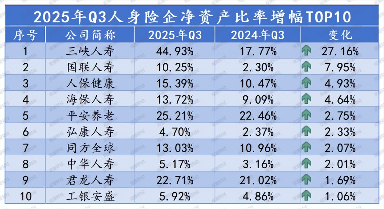 其中,三峡人寿净资产比率增长最快,2025年Q3净资产比率为44.93%,较2024年Q3增加了27.16个百分点。其余险企变化均未超10%。