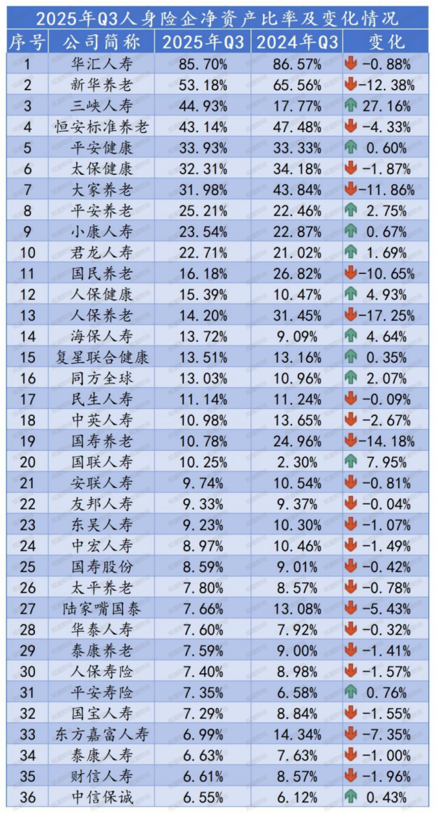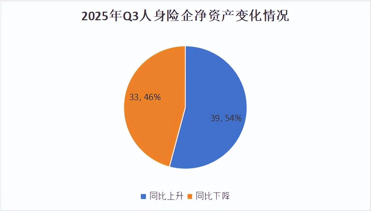 已公布2025年Q3净资产的72家人身险企中,54%险企实现净资产正增长,而46%的公司出现同比下降,这与2024年同期数据相去甚远。