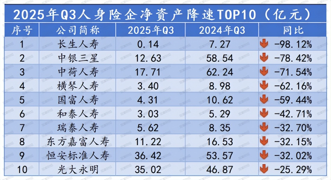 经观潮财经统计分析发现,2025年Q3净资产负增长TOP10险企中,大多数为中小型合资险企,其部分或与切换新会计准则有关,例如中银三星人寿、国富人寿。