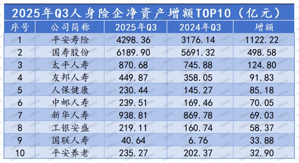 净资产增额TOP10:平安、国寿、太平3头部险企超百亿